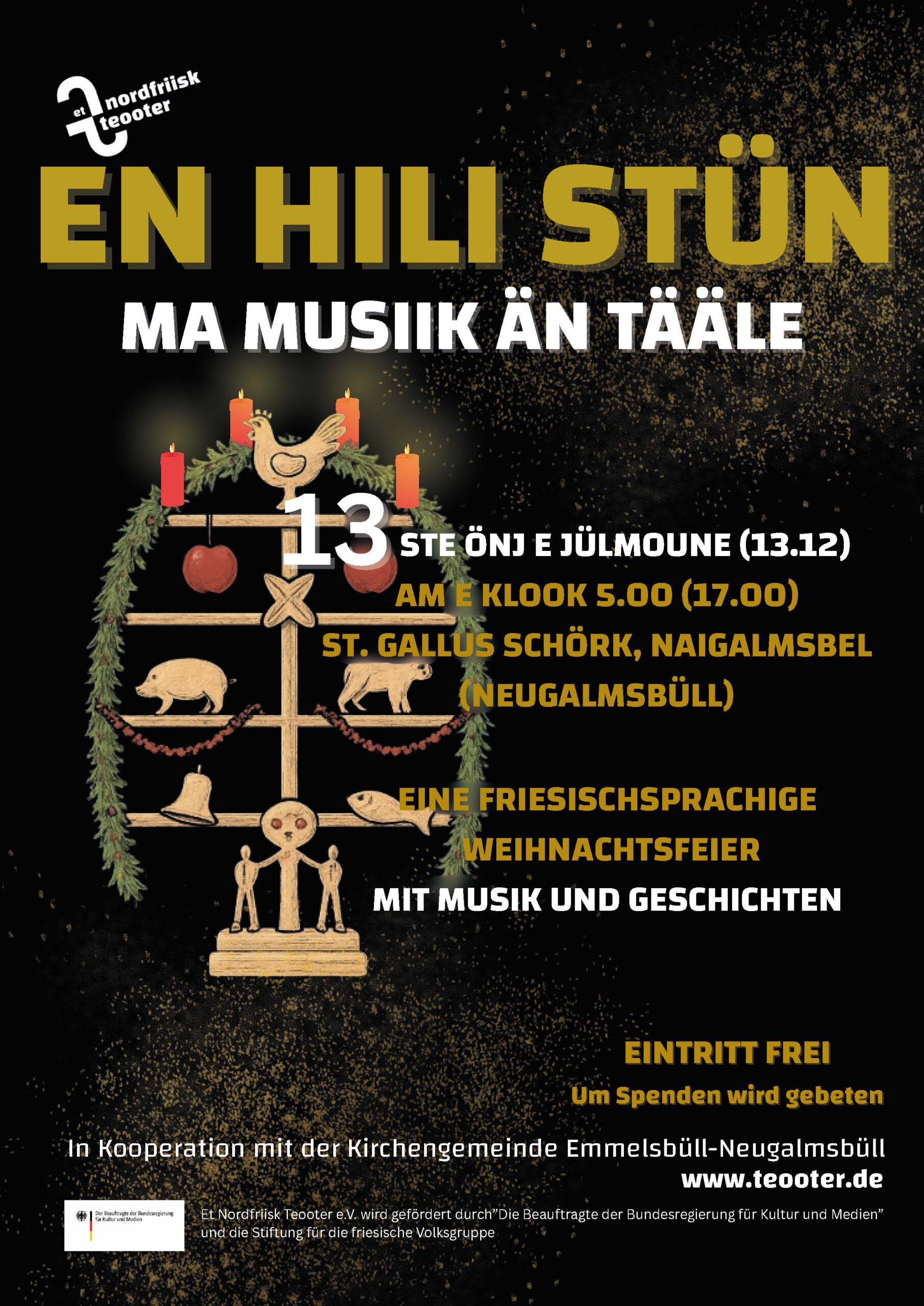 Die friesischsprachige Adventsfeier des Nordfriisk Teooters in Zusammenarbeit mit der Kirchengemeinde Emmelsbüll-Neugalmsbüll findet statt am 13.12.2025 um 17 Uhr in der Kirche St. Gallus in Neugalmsbüll. Der Eintritt ist frei, um Spenden wird gebeten.